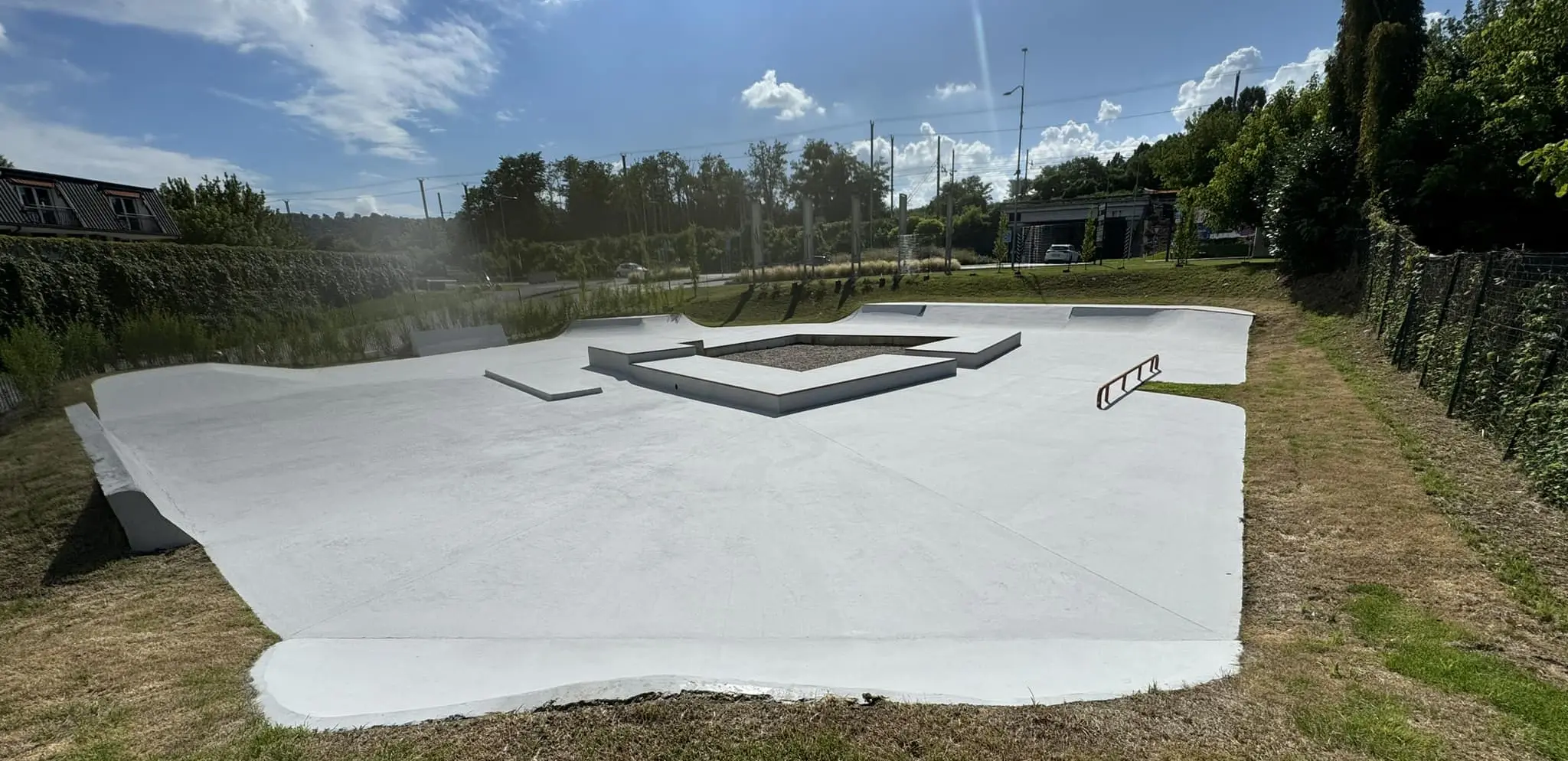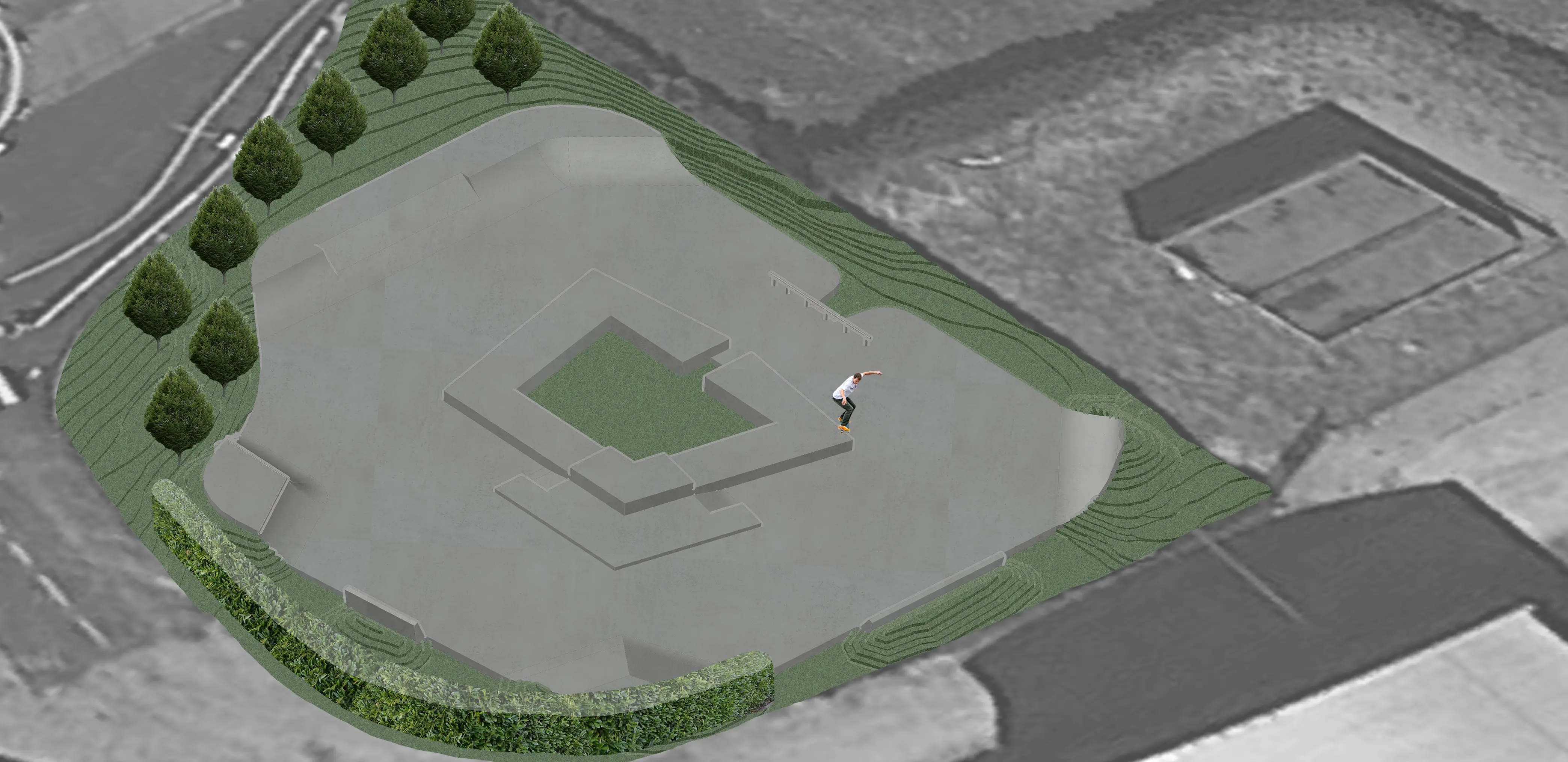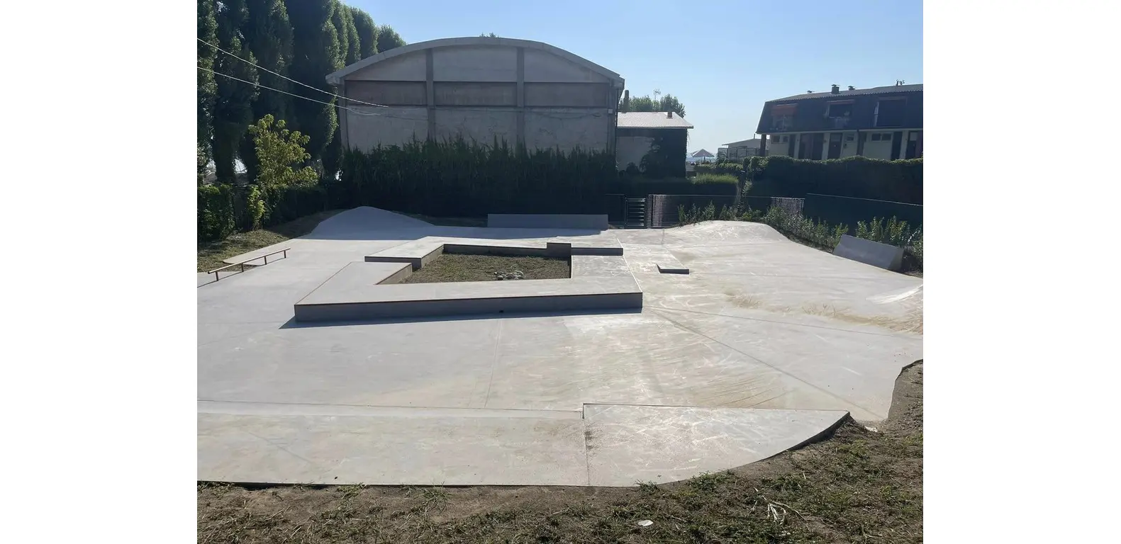 Partendo da un budget molto limitato a da spazi piuttosto piccoli abbiamo provato a realizzare il design di una skate plaza molto semplice caratterizzata essenzialmente da una composizione di muretti di varie altezze che letteralmente “gira intorno” ad una aiuola centrale nella quale avrebbero dovuto piantare un grande albero (poi eliminato dal progetto per non meglio precisate “questioni di sicurezza”). L'opera è stata realizzata dalla stessa azienda con la quale UAO Skateparks ha realizzato lo skatepark di Aosta, dunque anche in questo caso l'opera ha preso forma grazie a mani che hanno fatto esperienza in questo settore grazie a UAO skateparks.