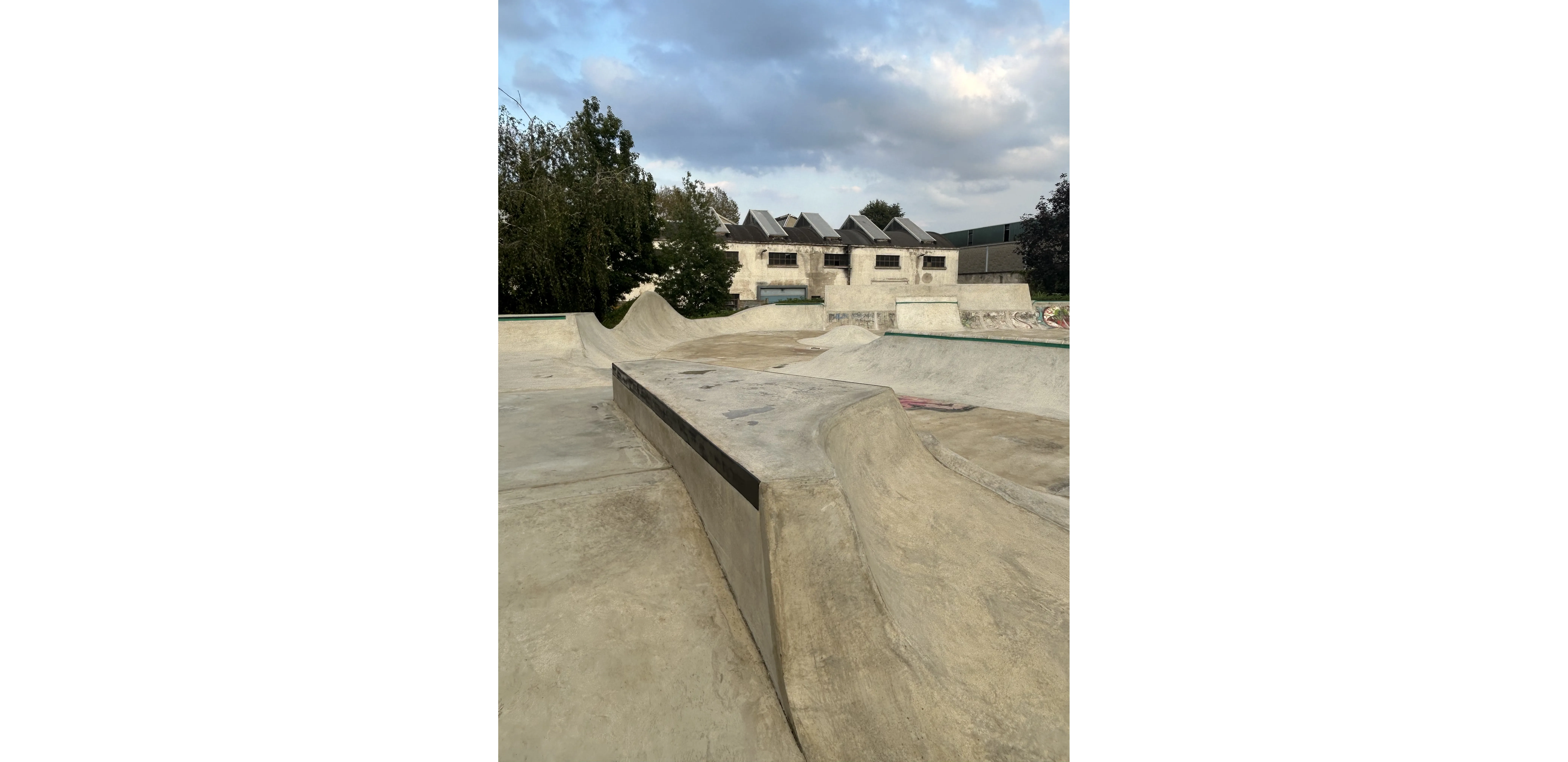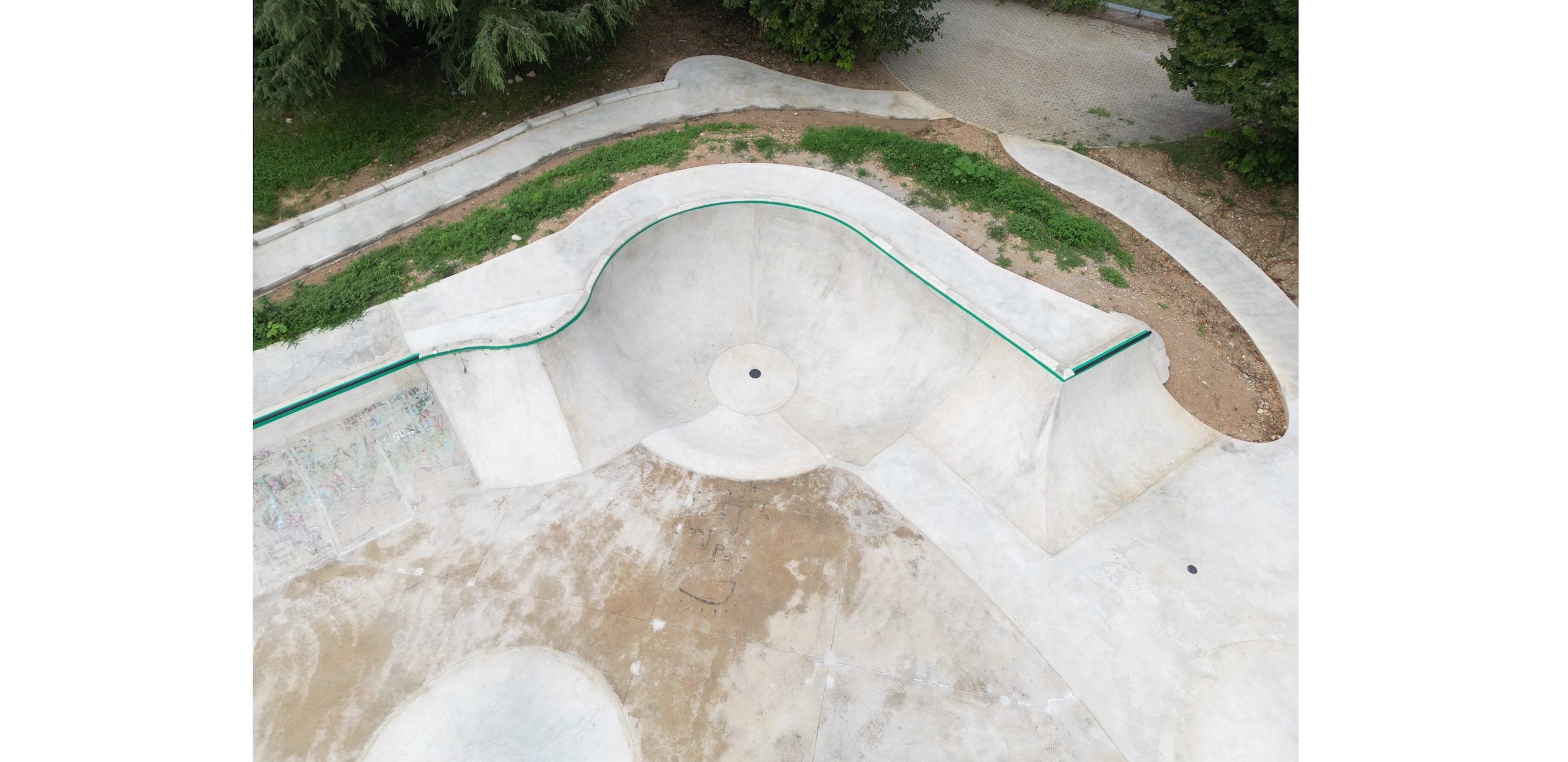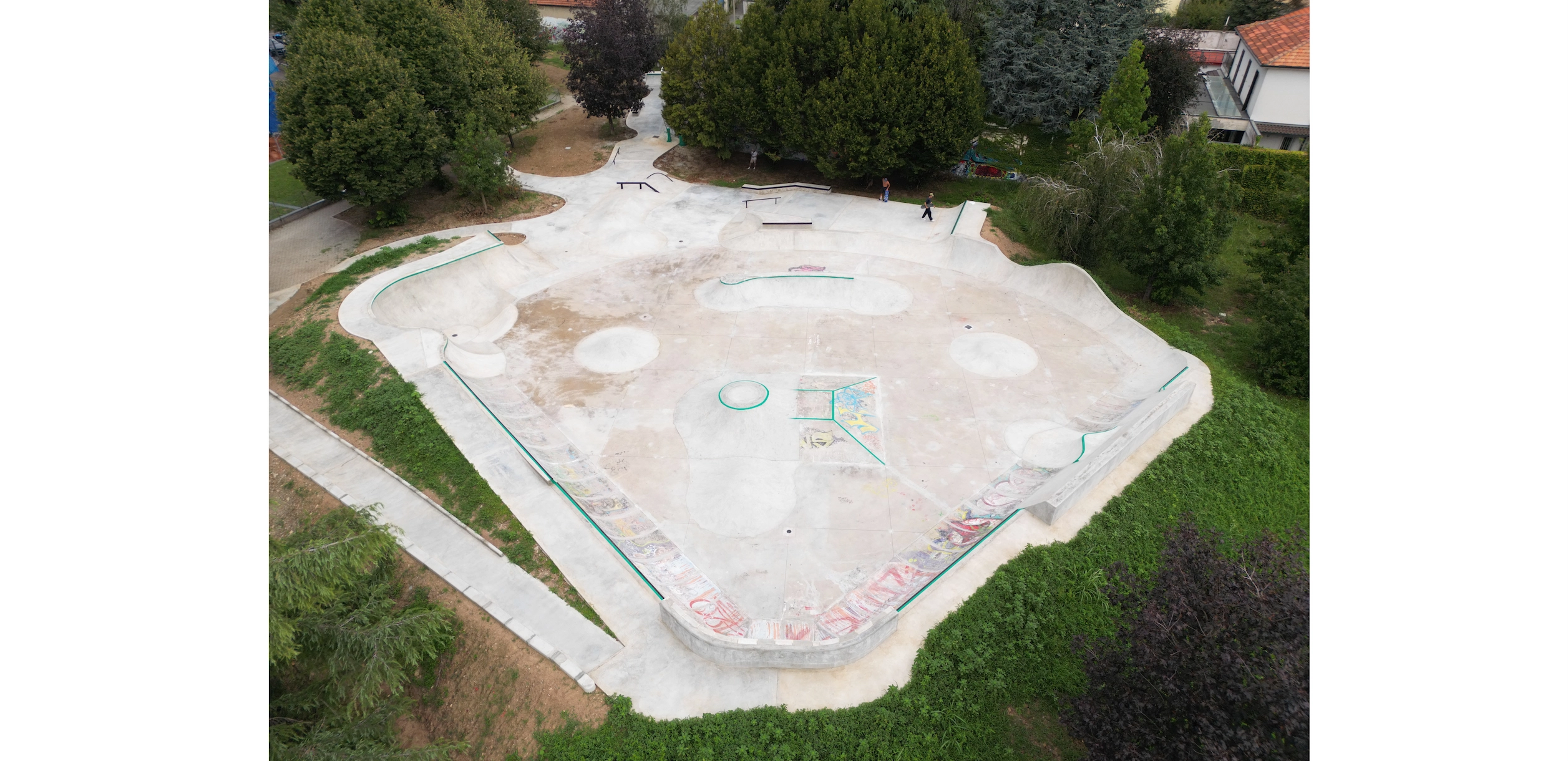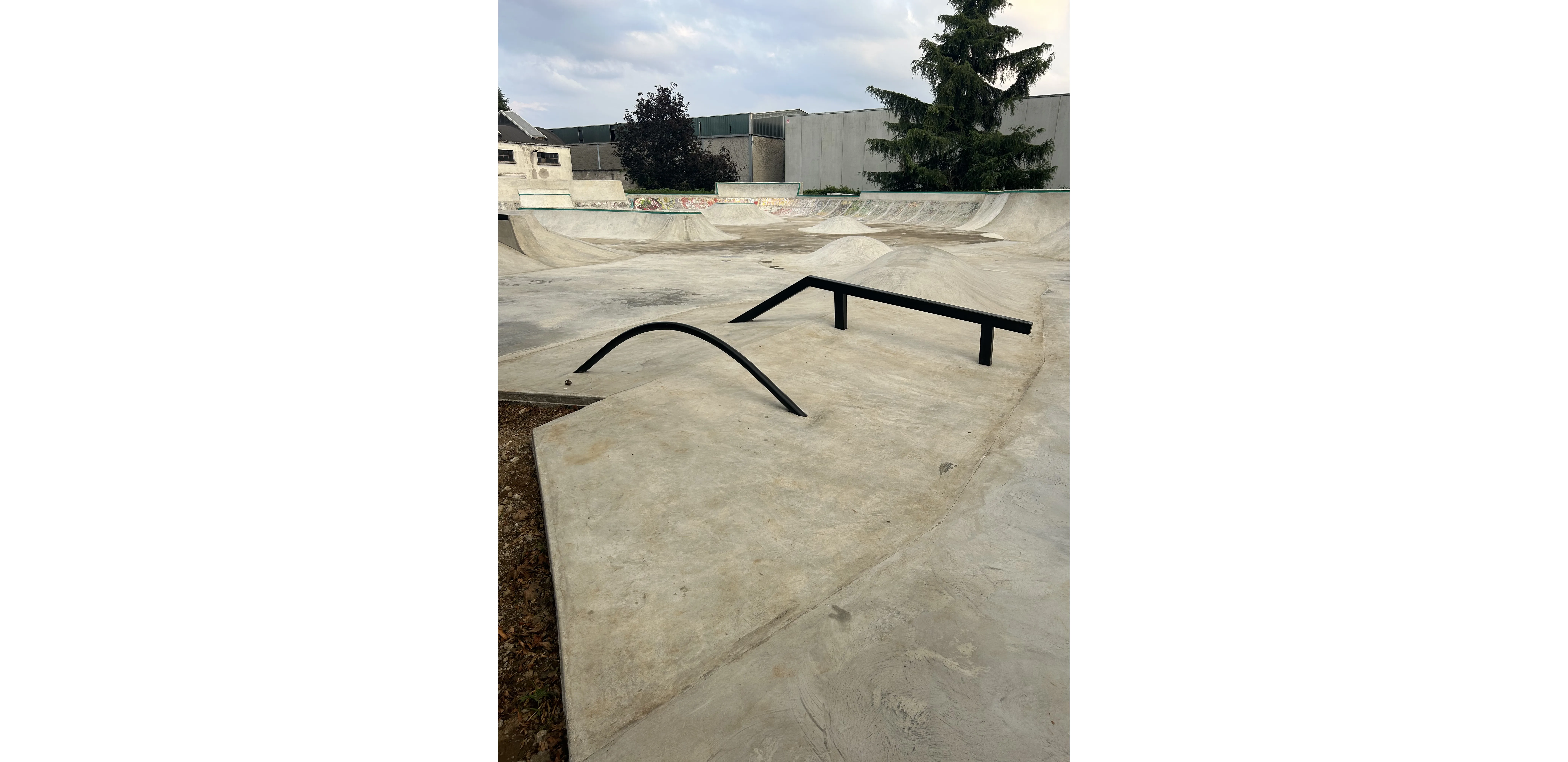 Molti interventi di quest'opera sono stati realizzati con la tecnica “taglia e cuci” ovvero per lavorare sull'esistente e modificarlo per farlo diventare “WOW” abbiamo dovuto tagliare chilometri di calcestruzzo armato, demolirlo e poi innestarvi le nuove forme da gettare sopra. Il risultato è un flow-skatepark di circa 1200 mq che si innesta sulla vecchia area “a ventaglio” che ospitava la struttura precedente e si estende oltre con un “blocco hubba” ed una linea street “solitaria” che si estende lungo il muro di cinta. Da notare la deepend a “chiusura” del ventaglio di quarter nonché il “taco-onda” in cui per la prima volta abbiamo sperimentato lo “over vert”!