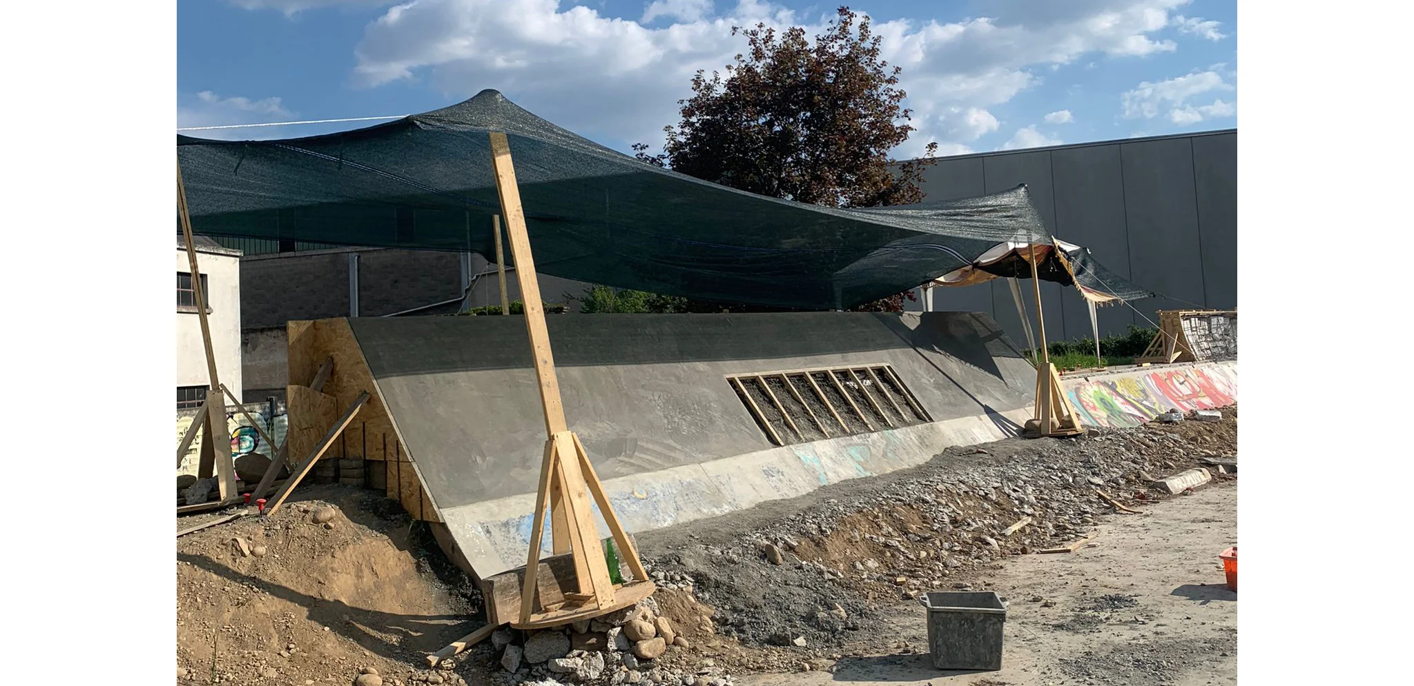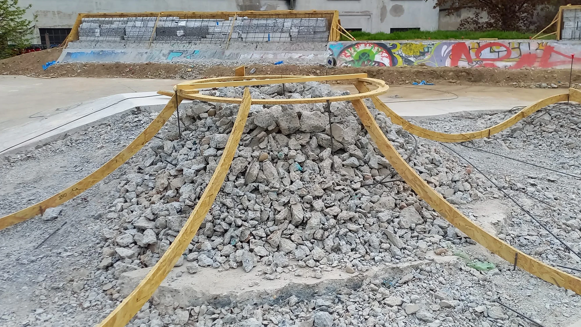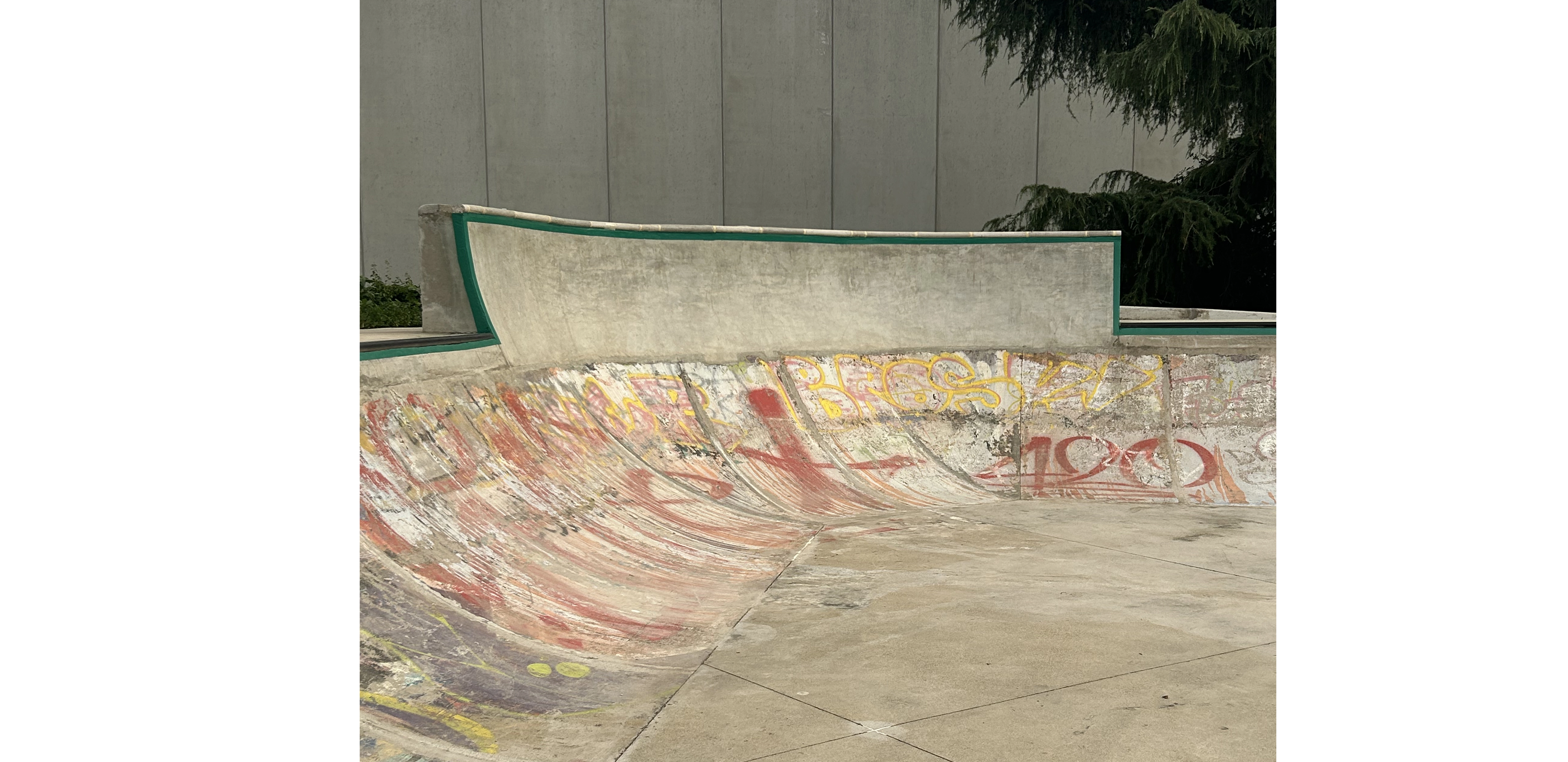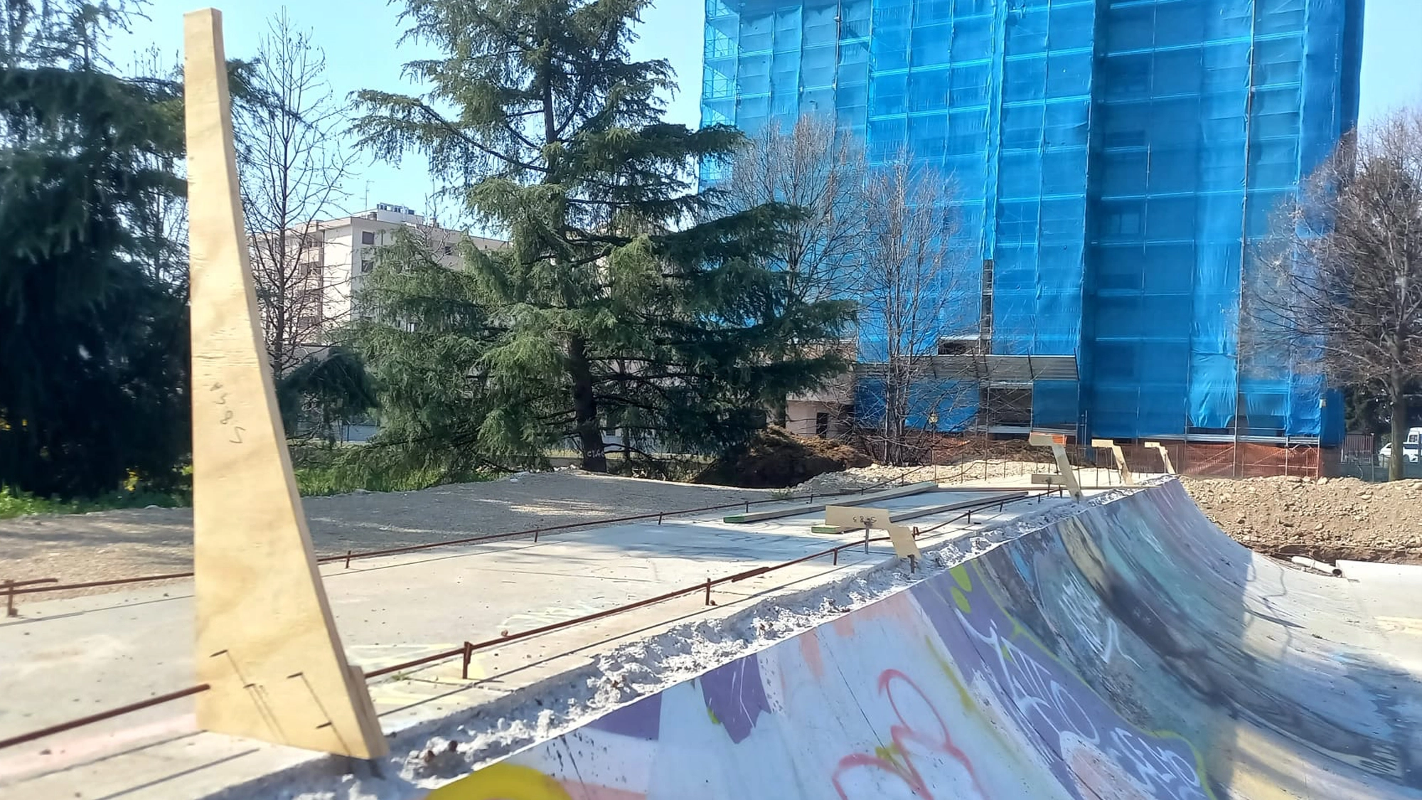 Molti interventi di quest'opera sono stati realizzati con la tecnica “taglia e cuci” ovvero per lavorare sull'esistente e modificarlo per farlo diventare “WOW” abbiamo dovuto tagliare chilometri di calcestruzzo armato, demolirlo e poi innestarvi le nuove forme da gettare sopra. Il risultato è un flow-skatepark di circa 1200 mq che si innesta sulla vecchia area “a ventaglio” che ospitava la struttura precedente e si estende oltre con un “blocco hubba” ed una linea street “solitaria” che si estende lungo il muro di cinta. Da notare la deepend a “chiusura” del ventaglio di quarter nonché il “taco-onda” in cui per la prima volta abbiamo sperimentato lo “over vert”!