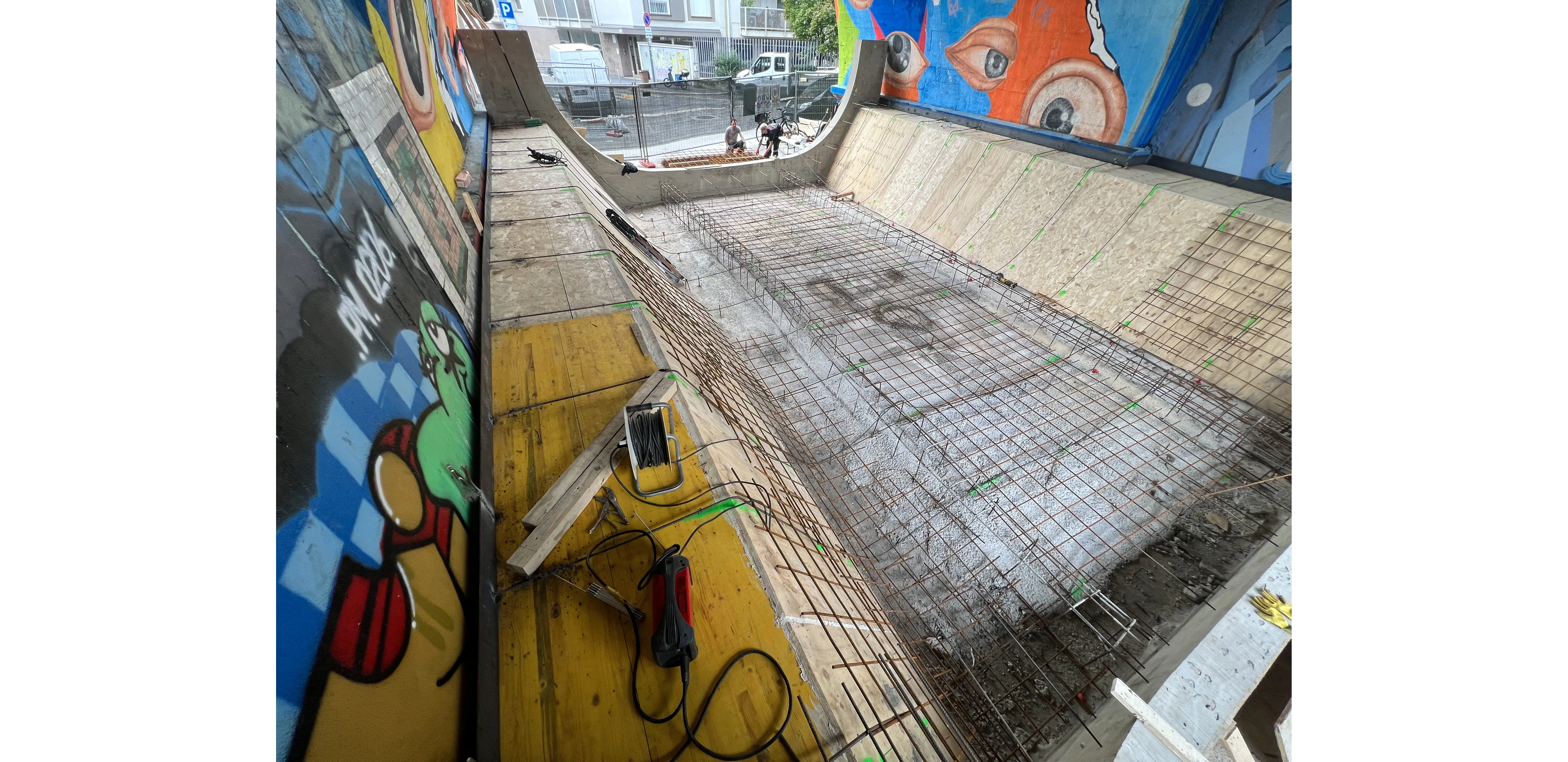 In un mese la piccola squadra (perlopiù Donato Lorusso e Stefano Tancredi) che si è fatta carico di realizzare le casseforme dell’opera si è cimentata in un lavoro impressionante di controventature, imbullonamenti, saldature di precisione e armature a strati “come la millefoglie”. Il risultato è la prima “mini half pipe” pubblica al coperto del comune di Milano… municipalità che ad oggi mercoledì 15 ottobre 2025 (un anno dopo la chiusura dei lavori da parte di UAO SKATEPARKS) non è ancora riuscita a trovare modalità, tempi ed modi per inaugurarla ufficialmente.